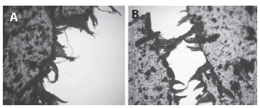 Los ensayos de tracción del material compuesto dieron como resultado una tensión de alrededor de 6,0MPa, con 17% de alargamiento y una densidad de 1,02g/cm3. La Figura 9 muestra las imágenes de microscopia óptica de la fractura del material compuesto.