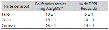El Cuadro 1 muestra que la cantidad de polifenoles en la corteza es mayor que en otras partes del árbol sin embargo las hojas también presentan una cantidad considerable de los mismos.