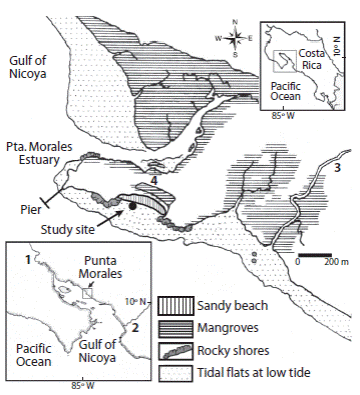 Study site: The intertidal flat is located on the South shore of the Punta Morales peninsula on the mid-upper region of the Gulf of Nicoya estuary (10oN-85oW) Pacific coast of Costa Rica. The sand-mud flat is limited to the North by a white sand beach. Rocky outcrops and mangrove stands are also prominent features of the peninsula (Figure 1). A dry season (December to April) and a rainy season (May to November) mark the seasonality of nutrient dynamics and water salinity, which have been described by Epifanio, Maurer & Dittel (1983) and Voorhis, Epifanio, Maurer, Dittel & Vargas (1983) as part of the ecological surveys mentioned before. Freshwater inputs from seasonal rains and runoff carried by the Tempisque and Tarcoles rivers (Figure 1) produce strong vertical and horizontal salinity gradients that drive estuarine circulation. Near Punta Morales the Largarto river (Figure 1) contributes suspended sediment loads during the rainy season.