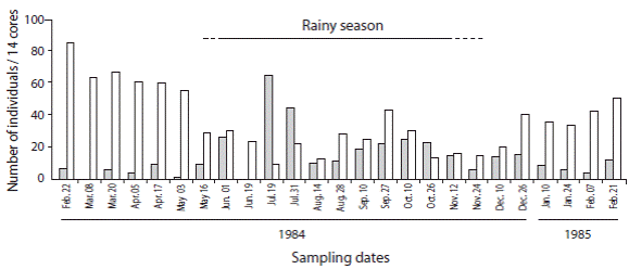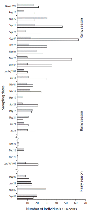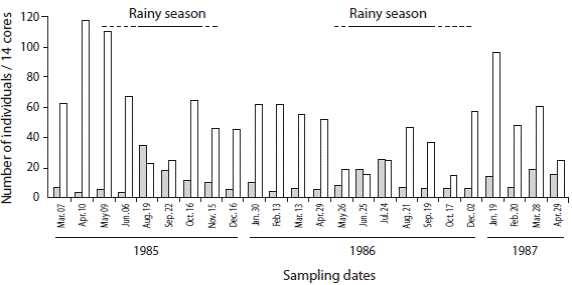 Field and laboratory methods: The sampling protocols are outlined in Vargas (1987, 1988a, 1989) and in Vargas-Zamora & Sibaja-Cordero (2011). In summary 14 cores (17.7 cm2 - 15 cm long) were collected at monthly intervals from muddy sands during low tide (mean tidal range: 3 m), from a 400 m2 plot located 20 m from a sandy beach (Figure 1). The original data set of Vargas (1987, 1988a, 1989) was expanded with additional data from MarchApril, 1987, for a total of 49 dates (February, 1984 to April, 1987) and with data collected at the site by Solano-Ulate (2007) from July 1994 to September 1996 (28 dates) using the same methodology. This sampling effort (77 dates) is unique in tropical intertidal soft-sediment studies. At the laboratory core samples were fixed in Rose