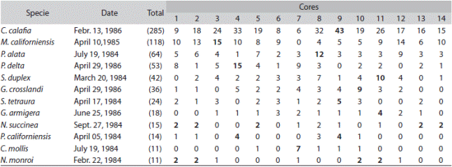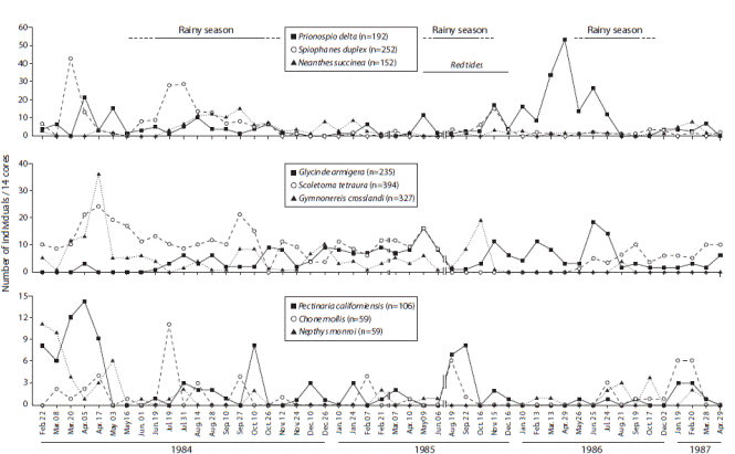 The abundance fluctuations of nine selected species from different families of worms are illustrated in Figure 5. for the 1984-1987 survey. In general, abundances were patchy in time. However, higher abundances were observed during the first half of 1984 and declined afterwards, with the exception of P. delta which had a peak after the red tides of 1985. The spatial distribution among the 14 cores of these nine species, and those of M. californiensis, C. calafia and P. alata, is illustrated in Table 3 for the date when the highest abundance of each species was found. Patchiness is space was also evident.