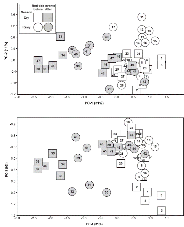 Results of a Principal Components Analysis (Figure 6) based on the abundances of the 43 species during 1984-1987 evidenced a change in the composition of the polychaete fauna: Dry season dates 1-6, and rainy season dates 10-16 of 1984 were grouped apart. Similar results occurred with rainy season dates of 1985 (28-34) and dry season dates of 1986 (33-38). Moreover, dates previous to the red tide events (starting around date 29) were scored at positive values of PC-1, and show less dispersion on the axes than dates after the red tide event (gray shaded in Figure 6). At around the mid rainy season of 1986 (date 42) the polychate composition became more similar (dates 43-49 grouped with pre blooms dates) to that of pre-red tide events. A two way ANOSIM indicated a small seasonal change in the composition of the polychaetes (R=0.10, p=0.022), and supported the changes after date 29 (June, 1985) when red tide events started (R=0.49, p<0.001).