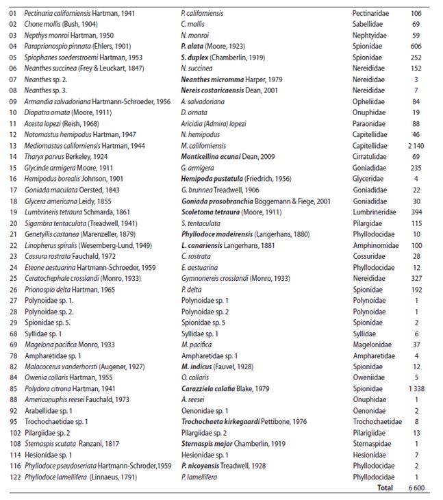 Bengal stained formalin in sea water and later sieved (500 micron mesh). Organisms were sorted and stored in ethanol filled shell vials. The original list (Vargas, 1986) of polychaete species was updated based on Dean (2009) and by inspection of the collections of voucher specimens deposited at the Museum of Zoology (University of Costa Rica) and at the Museum of Comparative Zoology (Harvard University). The presently valid names of species correctly identified in Vargas (1986), as well as those assigned to new taxa, were verified by accesing the web page w.w.w.WORMS (World Register of Marine Species).
