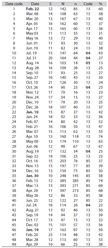 From the 1994-1998 survey we focused here on the population oscillations of P. alata and M. californiensis only. Thus, the abundance fluctuations of these two polychaete worms during the 77 sampling dates are included in Figure 2, Figure 3, and Figure 4 (Totals: 1078 cores, 1.90 m2 ).