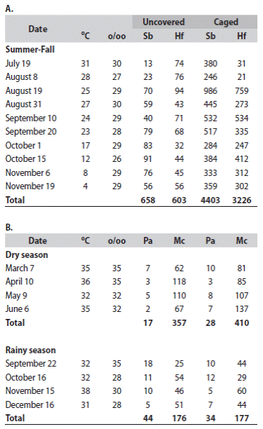 At the micro-scale level no significant changes in abundance of C. calafia were evident in response to the deployment of wire mesh cages on the sediment during the dry (Totals: 7 ind. outside vs 9 ind. inside) and rainy (Totals: 247 outside vs 147 inside) seasons of 1985 (Vargas, 1988a, 1996) Several species of the Spionidae and Capitellidae polychaete families are known to increase in abundance (Table 4A) in temperate latitudes inside wire mesh cages deployed to ameliorate the impact of macro-predators (see Reise, 1985). At the tropical site, however, the population changes inside vs outside cages of the spionid P. alata and the capitellid M. californienesis were negligible (Table 4B).