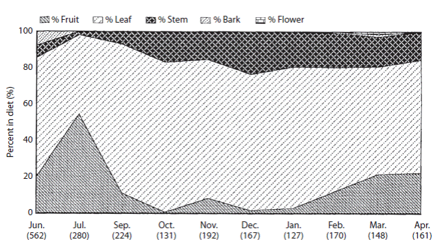 September through January (wet season) diets were relatively constant, with leaf as the most common food type eaten, followed by stem and fruit. No bites were recorded for either bark or flower during this interval. February and March (dry season) showed a slight decrease of leaf and stem in the diet, replaced by an increase of fruit. Bark and flower were infrequently registered in this period. April values of percent leaf, fruit and stem remained relatively stable from March values. Neither bark nor stem were recorded during this period.