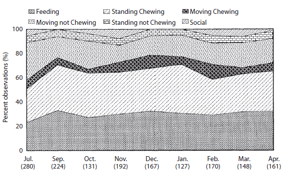 Standing not chewing (SNC): Average percent time spent standing not chewing (SNC) for the entire study period was 5,7% (Digital Appendix 5). Percent SNC observations for wet and dry season were 5,7 and 5,8% respectively. Neither the wet or dry season ratios of SNC to total observations were significantly different than the study long ratio (Digital Appendix 3). Similarly, the wet season ratio was not different than the dry season ratio.