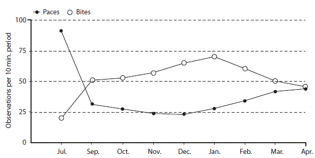 Bites and paces: The total number of bites taken and number of paces traveled between each bite was recorded during the first ten minutes of each half hour. A hand held audio recorder was used to record field observations.