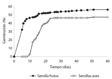La tasa de germinación fue menor para las semillas provenientes de las excretas (GR=5,2+1,3) que para semillas de los frutos (GR=21,0 + 4,3). Mientras que el tiempo medio de germinación fue menor para las semillas provenientes de los frutos (TMG=6,04+0,5) que para las semillas de las excretas (TMG=16,04+1,18).