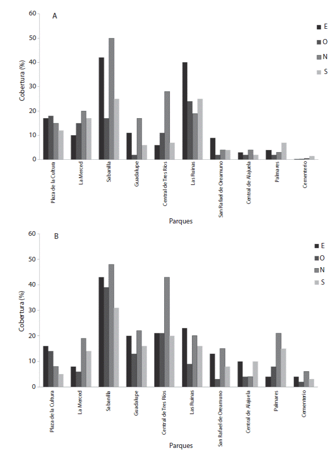 Dado que su distribución está condicionada por la posición geográfica y los factores climáticos, en el Hemisferio Norte, la mayor abundancia de líquenes se da en el lado norte de los troncos de los árboles, debido a que está menos soleado y conserva más humedad (Molina & Probanza 1992; Riquelme, 2008), con base en esa premisa cabe plantearse la siguiente interrogante: ¿Cuál punto cardinal (lado) del árbol y época es donde se presenta el mayor porcentaje de cobertura de líquenes en parques municipales del Gran Área Metropolitana de Costa Rica? Para darle respuesta decidimos analizar si el porcentaje de cobertura de líquenes varía durante la época seca y lluviosa y según el punto cardinal del árbol en diez parques municipales de la GAM.