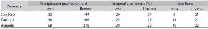 Las condiciones climáticas de la Gran Área Metropolitana de Costa Rica (GAM) son determinadas por los vientos Alisios del noreste y los del norte (Muñoz et al., 2002; Lizano, 2007; Cascante-Marín, 2012). Se tiene un promedio anual de 12 horas de luz y una temperatura promedio anual entre los 21°C y los 27°C, entre noviembre a diciembre se da la época más fría y de marzo a mayo la más caliente (Corrales, 2010). La precipitación mínima ronda entre los 1 200mm y 800 mm por año y existen variaciones a nivel nacional que permiten establecer claramente dos regiones tropicales: la lluviosa, entre mayo a noviembre; la seca, con poca lluvia, va de diciembre a abril (IMN, 2008).