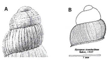 Baker (1927) figures Dysopeas translucidum protoconch (Figure 2B) and describes it as globose, of 2 to 2.5 convex whorls separated by a deep suture with a sculpture of very weak growth lines some 35 in number near the beginning of the second whorl.