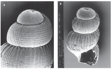 The nepionic sculpture of the Pseudopeas viviparumMiller protoconch is described by its author (1879) as of one whorl "minutely decussate", and by Pilsbry (1906) as one and a half whorls with very delicate, close, striate spirals. Pilsbry adds (1906) that Pseudopeas has a protoconch of some two whorls "spirally striate" and figures P. saxatile (Morelet, 1885) from West Africa (Figure 2A) with typical apical sculpture of Pseudopeas, spiral and granulate. Although Pilsbry does not mention the granulation, it is clearly shown in his figure.