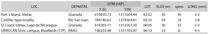 The study of Nicaraguan land snails is fragmentary. Since the year 1992 some 160 specimens of a small Opeaslike gastropod have been collected in Nicaragua that correspond to Baker's description of genus Pseudopeas (Dysopeas) with spirals extended to all whorls. The first site was at El Castillo on the San Juan River in Southern Nicaragua, among volcanic building blocks, dislodged from the castle ramparts (López, 1992). A second location was at the Isletas, a group of islands in Cocibolca (Nicaragua) Lake near the town of Granada and a third on the Campus of the URACCAN university by the town of Bluefields on the Caribbean coast (Table 1).
