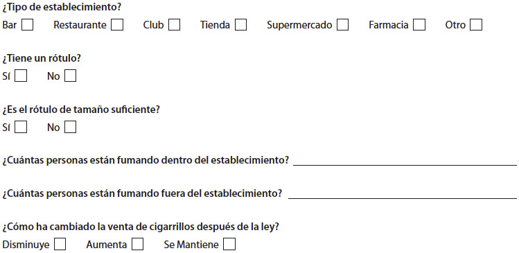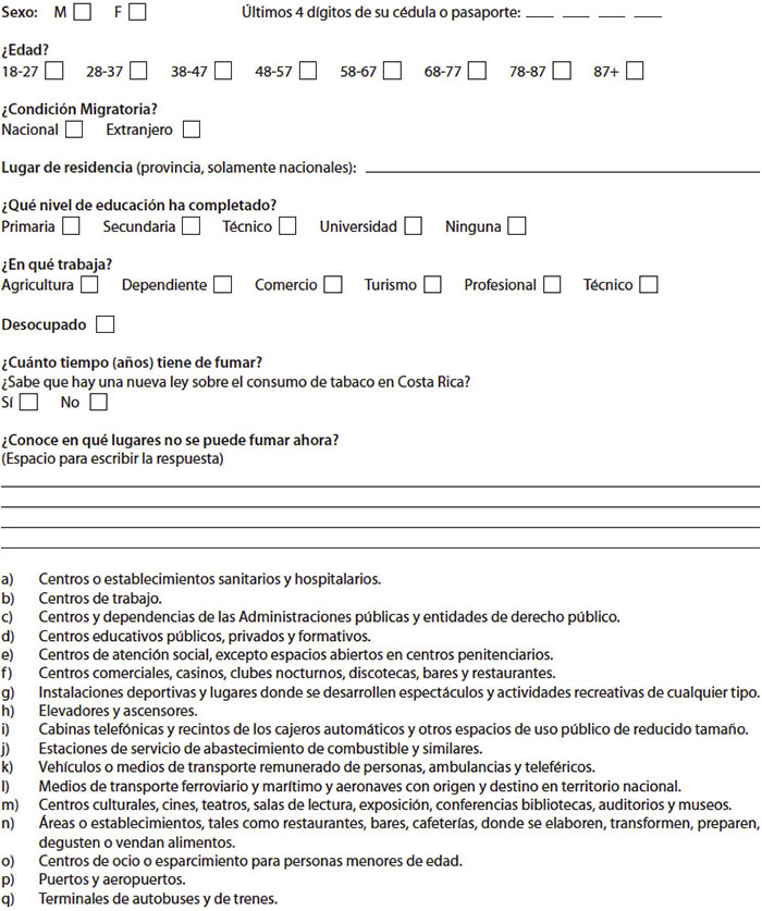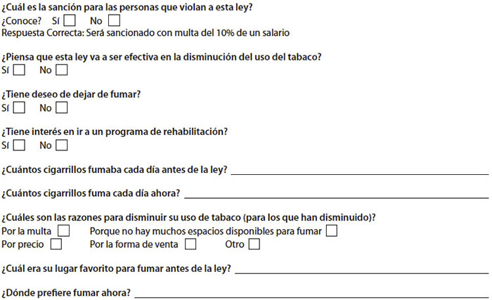 Procedure: Establishments were chosen by selecting a random starting point and taking data on every successive establishment along the street. For the establishment data, I entered the chosen establishments to verify if they had the required no smoking signs of the correct size, and if people were smoking inside the establishment. If the establishment was one that sold cigarettes an employee was asked if they had noticed a change in cigarette sales after the implementation of the new law (Appendix B). Furthermore, a series of interviews with smokers was conducted. Both residents and non residents of these two areas were interviewed. The researcher walked the streets of the two locations looking for people actively smoking. These people were then approached and asked if they would be willing to participate in the research. Oral consent to participate in the survey was given by every participant, they were also offered the opportunity to give the researcher the last four digits of the person's cédula or passport so that their data could be encountered and removed later if they wished. The researcher used a questionnaire that gave each interviewee a select number of choices to pick from in order to allow for quantitative analysis; all responses were verbal (Appendix A). The participants were asked basic questions such as age, occupation, educational level, and residence. The researcher then asked questions to ascertain the participants' knowledge and attitude about the new law. The participants then answered questions on their daily tobacco use and any changes that they had noticed after the new law, as well as their thoughts on quitting. The proposal for this study was approved by the ACM ethics panel and I followed a Plan for Protection of Human Research Subjects.
