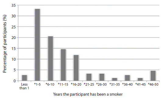 Smoking history: Very few of the participants had been smoking for less than a year. Most had been smoking for 1-5 years with a steady decrease in participants up to the 16- 20 year group. There were very few participants in the subsequent groups which went all the way up to 50 years of smoking (Figure 1). Across all participants, 62% expressed a desire to quit smoking with 38% claiming no interest. Also, 74% of people were not interested in a rehabilitation program to quit smoking while 26% were interested.
