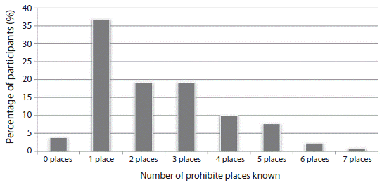 Law Knowledge and Attitudes: Only 13.33% of those interviewed did not have any knowledge of the law, with 86.67% claiming some level of knowledge concerning the new tobacco legislation. Of those who had knowledge about the new law a few could not identify any places in which it was prohibited to smoke. Most participants knew only one place. About the same number of participants knew two or three places, with subsequently less participants in the following knowledge levels (Figure 2). As far as the penalty for smoking in a prohibited place, 68% of all participants did not know what the penalty was and only 32% were able to accurately describe the fine. Finally, 56.06% of participants believed that the new law would not be effective in decreasing smoking. Only 43.94% of participants believed that this new legislation would cause a decrease in smoking in Costa Rica.