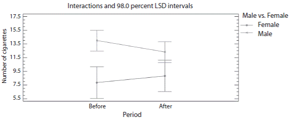 Gender and Change in Tobacco Use: Male participants smoked a significantly larger quantity of cigarettes than females overall both before and after the smoking ban (F= 11.69, DF= 1, 290; p= 0.0007). However, there was not a significant change in the number of cigarettes consumed per day after the tobacco ban for either males or females (F= 0.07; DF= 1, 290; p= 0.80) (Figure 4).