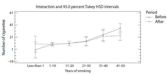 Desire to Quit Smoking and Change in Tobacco Use: The participants who indicated a desire to quit smoking were shown to smoke more cigarettes each day (x = 13.66) than those who did not want to quit (x̅ = 8.54) ̅ (F= 15.20; DF= 1, 290; p= 0.001). There wasn't a significant change in number of cigarettes smoked per day after the law for either group (F= 0.11; DF= 1, 290; p= 0.74).