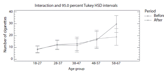 Age Group and Change in Tobacco Use: The mean number of cigarettes per day increased similarly through the first four age groups. However, the fifth age group showed a much greater use of cigarettes before than after the law. The oldest age group showed a strongly decreased usage both before and after (F= 12.93; DF= 4, 284; p<0.0001). The mean number of cigarettes did not significantly change before and after the new law for any age groups (F= 2.13; DF= 1, 284; p= 0.15) (Figure 6).