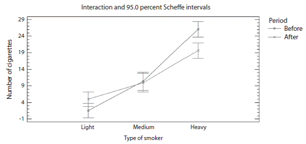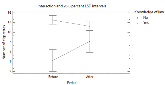 Data Analysis: I used three parametric, one-way ANOVAs to estimate differences in mean: 1) "number of cigarettes consumed per day" between "desire to quit or not to quit"; and 2) "percentage of places known where not to smoke" between: a) gender, and b) educational level. I used parametric, two-way ANOVAs to estimate differences in mean "number of cigarettes consumed per day" between "before" and "after" passage of smoking law and a) gender, b) age groups, c) years smoking, d) occupation, e) educational level, f) type of smoker, and g) knowledge of existence of smoking law. I used a paired comparisons two-way ANOVA to estimate difference in mean "number of cigarettes consumed per day" between the same interviewees "before" and "after" passage of the smoking law. A posteriori comparisons between means were carried out with Least Significant, Tukey or Scheffe tests. Statistical procedures followed Sokal and Rohlf (1995). Statistical analysis was completed with Statgraphics Centurion XV Version 15.1.02 (Statpoint Technologies, Inc.).