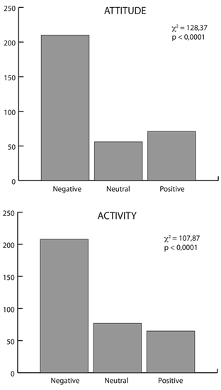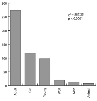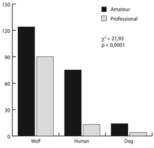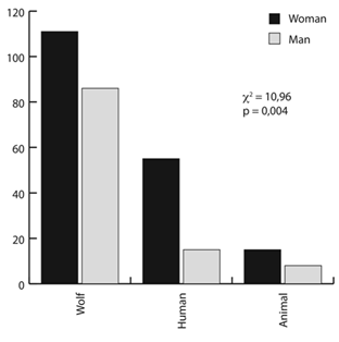Most artists represented the wolf’s attitude (c2: 128,37; p<0,0001) and activity (c2: 107,87; p<0,0001) as negative (Fig. 1-2); and most painted the wolf as a wolf, but amateurs were more likely to optionally represent it as a human (c2: 77,82; p<0,0001) (Fig. 3).