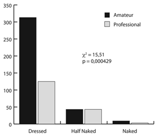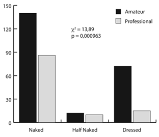 Both amateurs and professionals painted the wolf mostly without clothes (c2: 13,89; p<0,000963), but amateurs were more likely to dress him (c2: 109,86; p<0,0001) (Fig. 9). Both professionals and amateurs represented Red with her clothes on (c2: 15,51; p<0,0004), but amateurs dressed her in higher numbers (c2: 456,09; p<0,0001) (Fig. 10).
