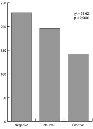 positive if they were smiling, or looked happy or otherwise pleased. They were considered negative if they were smirking, looked angry, confused, scared, doubtful, sexually aggressive, or something similar. When the face was not visible, or had no negative or positive expression, it was classified as neutral. The Environment was classified as positive when it was sunny, a forest with flowers and nice foliage, or similar. It was negative if it looked cold, dark, dangerous, unpleasant, or similar. When texts described one of them with praise, insults, etc. they were also used to decide if the overall representation was positive, negative or neutral.