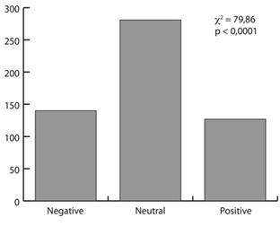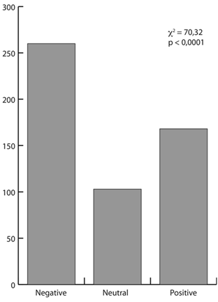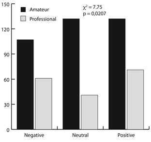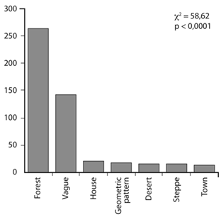 Professional artists represented the environment as positive (c2: 8,09; p<0,0175), while amateurs were equally divided among positive, negative and neutral (c2: 3,37; p<0,1854) (Fig. 7). Furthermore, the environment was not always represented as a forest, but that representation dominated (c2: 858,16; p<0,0001) (Fig. 8).