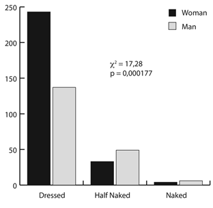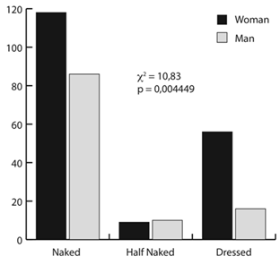 Both women and men painted Red mostly dressed (c2: 17,28; p<0,000177), but women had a higher proportion of dressed Reds (c2: 364,51; p<0,0001) and wolves (c2: 98; p<0,0001), although most artist had an undressed wolf (Fig. 14 and 15).