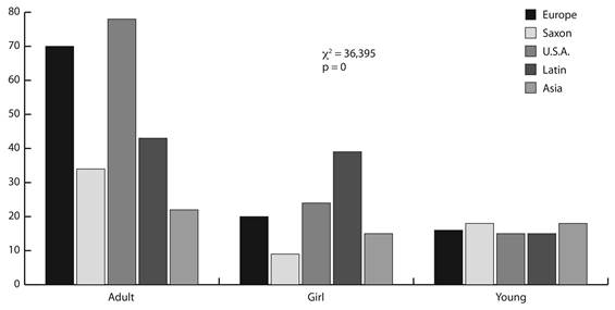Both professionals and amateurs represented Red’s attitude mostly as negative (c2: 70,32; p<0,0001) (Fig. 4). Artists in general represented Red’s activity as neu tral (c2: 79,86; p<0,0001) (Fig. 5). She was mostly repre sented as an adult woman, followed by representations as child or, less frequently, a young woman (c2: 587,25; p<0,0001) (Fig. 6).
