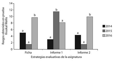 Entre el 2014 y 2015 no hay diferencias significativas. Entre estos años con relación al 2016 hay diferencias significativas para la ficha y el Informe 2, en ambas evaluaciones se obtienen calificaciones más altas en el 2016. En el informe 1 se obtienen calificaciones más altas en el año 2015.