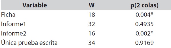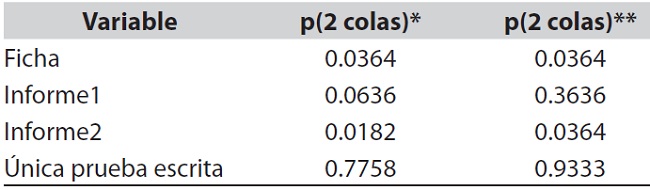 En la figura 1 se puede observar que las medias con una letra común no son significativamente diferentes (p<= 0,05). Ficha técnica (H= 7.6, p= 0.0033), Informe 1 (H= 5.49, p= 0.037) e Informe 2 (H= 8.77, p= 0.0005). La única prueba escrita no resultó significativamente diferente en ningún caso.
