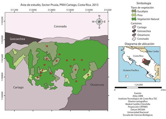 El Sector Prusia (09°95’35”N - 083°88’13” W, Niehaus et al., 2012; Fig. 1) tiene una precipitación promedio de 1527,9mm anuales; sin embargo, es menor a finales de julio y principios de agosto. La estación lluviosa se prolonga durante todo el año, con excepción de febrero y marzo y su temperatura anual es de 14°C (Bermúdez & Conejo, 2008). Este sitio presenta dos zonas de vida, bosque muy húmedo montano y bosque pluvial montano, los cuales se encuentran a una altitud entre 2400 a 3700 m.s.n.m. (Quesada, 2007; Bermúdez & Conejo, 2008).