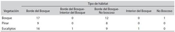 Independientemente del tipo de vegetación, la mayor parte de las especies se caracterizan por encontrarse en el borde del bosque, donde el bosque presentó los valores más altos,17 especies (Cuadro 1). En el pinar los valores difieren solamente por una especie en las categorías borde del bosque y borde del bosque-no boscoso El tipo de hábitat de los individuos resultó ser dependiente del tipo de vegetación (x2= 24,78; p <0.01).