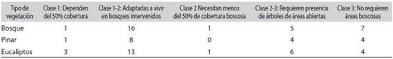 Las especies se clasificaron en cinco categorías, según el nivel de dependencia del bosque (Stiles, 1985; Hidalgo, 2009). En la Clase 1, aves que dependen al menos de un 50% de cobertura boscosa interconectada con grandes áreas de bosque, Clase 1-2, son aquellas que se adaptan a bosques intervenidos. Clase 2, aves que sobreviven en bosques fragmentados y alterados, con menos del 50% de cobertura boscosa. Clase 2-3, aves que necesitan la presencia de árboles asociados a las áreas abiertas y Clase 3, aquellas que no requieren áreas boscosas, pueden sobrevivir en áreas de crecimiento secundario, cercas vivas y áreas de cultivos.