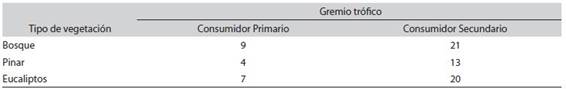 El gremio trófico que dominó en todos los tipos de vegetación fueron los consumidores secundarios (Cuadro 3). Por otro lado, el gremio trófico de las especies no depende del tipo de vegetación (x2= 0,95; p>0.10).