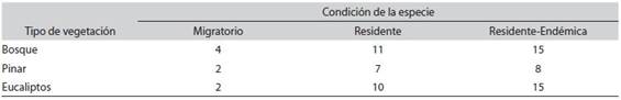 Se registraron 36 especies pertenecientes a 14 familias en los tipos de vegetación evaluados (Apéndice 1). De éstas, las que presentaron mayor riqueza fueron: Parulidae (n= 7, especies), seguida de la Emberizidae (n= 6), y Trochilidae (n= 4). Existe un alto porcentaje de especies compartidas entre el bosque y los eucaliptos (90%), los eucaliptos y el pinar tienen en común el 63%, sin embargo, entre el bosque y el pinar se comparte un 46,67% (x2= 12,76; p<0.01).