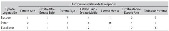 En el bosque se registró una mayor riqueza en el estrato medio y alto de la vegetación, al igual que los eucaliptos (n=9); en el caso del pinar se determinó que las especies tienden a encontrarse en el estrato bajo-estrato medio (n=6). La distribución vertical de las especies registradas, está asociada con el tipo de vegetación (x2= 35,46; p<0.01) (Cuadro 5).