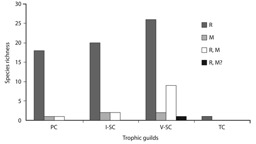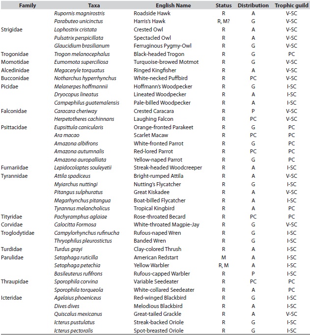 According to the trophic guilds (Fig. 2), the 25,3% corresponds to primary consumers (21 species such as Columbina passerina, Amazona albifrons and Amazilia rutila). The 28,9% are secondary consumers that feed on invertebrates (25 species represented by Agelaius phoeniceus, Bubulcus ibis and Colinus cristatus) and the secondary consumers species of small vertebrates were represented by 45,8% (37 species, including Anhinga anhinga, Rupornis magnirostris and Pitangus sulfuratus).