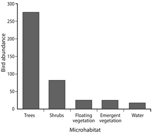 The birds in Corral de Piedra Palustrine Wetland area use primarily trees to perch (65,7% of the observations). However, an important number were using shrubs (19,3% of total observations), 4,6% use emergent and floating vegetation and only the 4,3% were observed using the water as main microhabitat (Fig. 3).