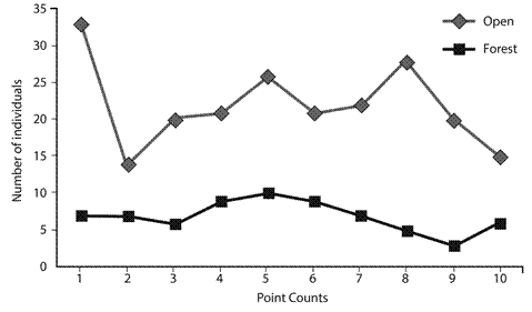 On each fixed-radius point counts, all individuals seen or heard calling during the survey period were recorded and the numbers of individuals per species were estimated in open and forest areas between 5:00 to 9:00 hours during 6 minutes where the counting efficiency is maximized (Thompson & Schwalbach, 1995).