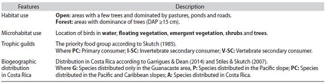 Wetlands and slightly disturbed areas have a high number of species such as insectivorous, because these areas maintain abundant of invertebrates, which are secondary consumers’ birds (Kyerematen et al., 2014). Resident species play important roles as pollinators and fruit dispersers in the ecosystem thereby add significant value to the ecological dynamics of forests in the area (Carranza & Esteves, 2008), and particular importance of conservation to tropical dry forests in Costa Rica and the Central American region.