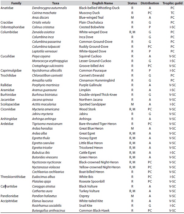 We recorded 83 bird species belonging to 36 families (Table 2). The most abundant families were Ardeidae (11 species) and five species to Accipitridae, Columbidae, Psittacidae, Icteridae and Tyrannidae. The 79% (64 species) have resident status in Costa Rica for example Aramus guarauna, Herpetotheres cachinnans, and Dendrocygna autumnalis. The 14,8% (12 species) have resident-migratory status such as Cathartes aura, Egretta tricolor and Mycteria americana. The 4,9% (4 species) have migratory status as Actitis macularius, Anas discors and Ardea herodias.