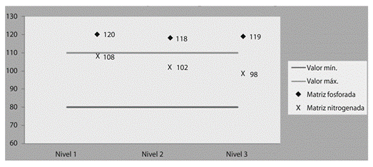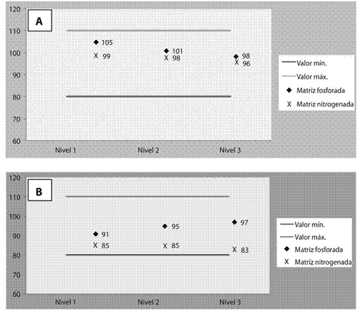 Elementos analizados en llama: como se observa en los Cuadros 4 y Cuadro 5, tanto en la matriz fosforada como nitrogenada, para el cadmio se obtuvieron valores aceptables, debido a que la recuperación se mantuvo muy cercana al 100% (±5%), y la precisión fue menor al 2% entre las réplicas en cada nivel de concentración. Por otra parte, los resultados para el cromo fueron muy buenos, satisfaciendo los criterios de aceptación establecidos, lo cual evidencia que el método analítico es exacto y preciso, prácticamente para cualquier punto de la curva de calibración de ambos metales. Ambos casos se evidencian en la figura 1.