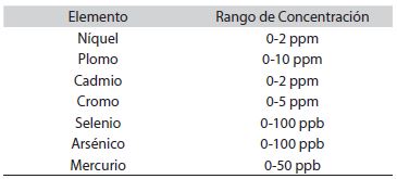 Para el análisis de los metales se utilizó la técnica de espectroscopia de absorción atómica con llama para níquel, cromo, cadmio, plomo; horno de grafito para arsénico, selenio; y generador de hidruros para mercurio. El equipo utilizado es marca Perkin Elmer, provisto con automuestreador y utilizando tanto la lámpara de cátodo hueco, como la de descarga de electrones, por la misma variedad en la naturaleza de las especies en estudio. Una vez insertadas las muestras, las especies metálicas son identificadas y cuantificadas por interpolación con las curvas de calibración. Los reactivos empleados: HCl (37%), agua destilada y los respectivos estándares certificados para cada metal.