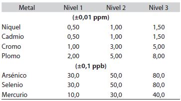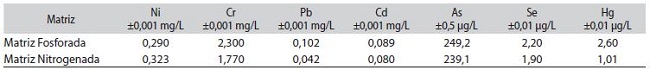 Conocidos los valores teóricos se procedió a enriquecer las matrices según los factores antes establecidos. En el Cuadro 3 se despliegan las concentraciones para cada metal, a las cuales fueron enriquecidas tanto la matriz fosfatada como nitrogenada.