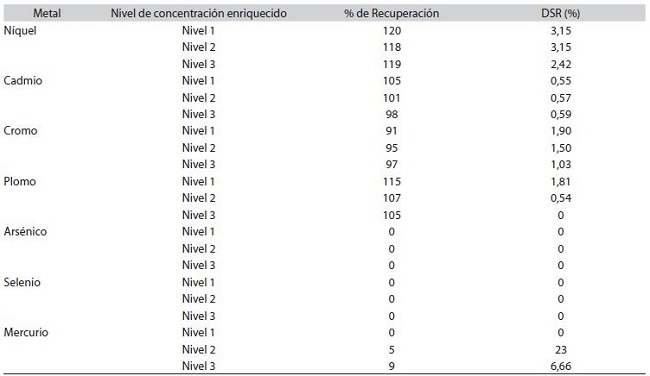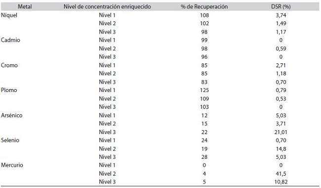 Al evaluar la recuperación de los metales pesados níquel, cromo, cadmio, plomo, arsénico, selenio y mercurio, para el método analítico de fertilizantes nitrogenados y fosfatados por espectroscopía de absorción atómica en llama, horno de grafito o generador de hidruros. Los resultados se resumen en los Cuadros 4 y 5 en los cuales se despliegan tanto los valores de recuperación como los de DSR (desviación estándar relativa) para los metales analizados en las matrices fosfatadas y nitrogenadas. Es importante destacar que para estos dos parámetros se siguen los criterios de aceptación establecidos por la AOAC para la validación de métodos analíticos donde %R: 80-110% y DSR: >2% (Sandoval, 2010).
