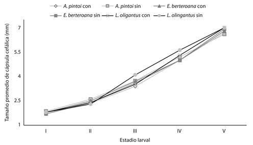 Las orugas alimentadas con Arachis pintoi sin suplemento vitamínico, en el I estadio larval, produjeron capsulas cefálicas de mayor tamaño (ANDEVA: p = 0,0016; gl = 2;