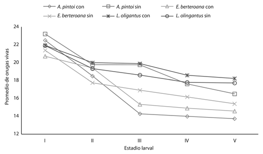 Se evaluó la tasa de supervivencia de las orugas en cada uno de los estadios larvales, se realizaron conteos de las orugas vivas cada tres días. Las orugas muertas no fueron reemplazadas.